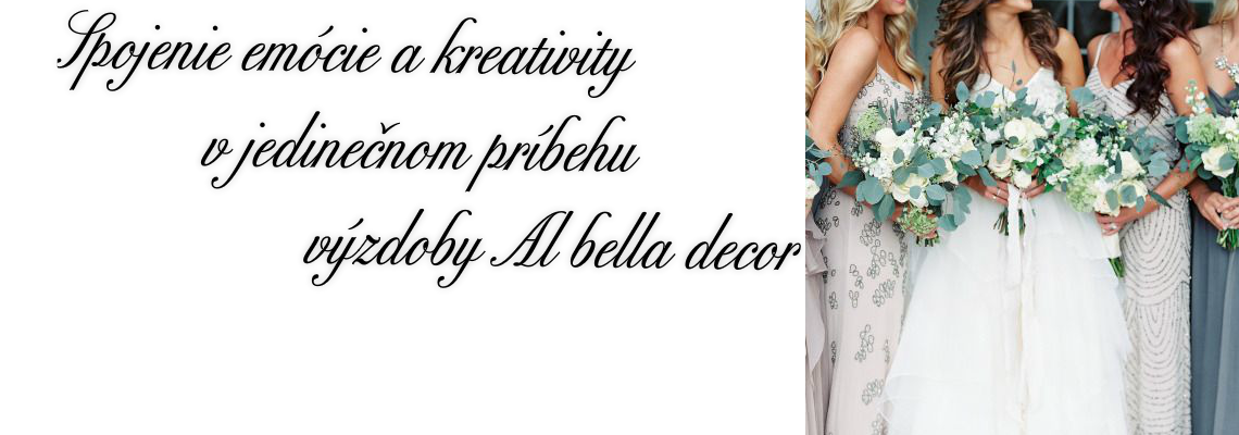 Vitajte na stránke Al bella decor. Na našej oficiálnej stránke sa intenzívne pracuje, preto sme sa rozhodli predstaviť sa Vám, zatiaľ, takto. Sme nová a svieža svadobná agentúra, ktorá sa rozhodla spojiť emóciu a kreativitu a vytvoriť príbeh výzdoby, na ktorý sa len tak ľahko nezabúda. Do každej našej výzdoby dávame lásku, precíznosť a snažíme sa, aby každá akcia bola výnimočná a originálna. Máme radi príbehy, emócie a ľudí, ktorí to všetko vytvárajú. Okrem realizácie svadobných výzdob, realizujeme aj výzdoby osláv, firemných akcií, ale i stužkových slávností, či plesov. Vieme zabezpečiť i tlačoviny a poradiť Vám, čo je aktuálne trendy. Ak plánujete svadbu, či oslavu, kontaktujte nás. Tešíme sa na spoločnú spoluprácu :)